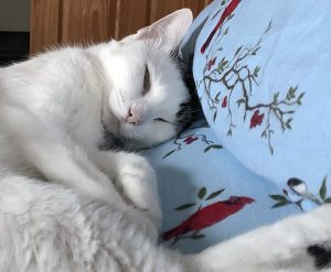 Annie sleeping on cardinal sheets